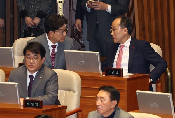 图为7日在韩国国会全体会议期间,国民力量党议员秋庆镐与权性东正在交谈。当天的议题包括尹锡悦总统弹劾案和金建希特检法案的表决。【照片来源:韩联社】