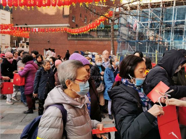 2月3日中午,天空晴朗,阳光明媚,伦敦唐人街锦里门前广场上,几十位华人长者聚集在室外餐座旁,引来了许多游客和路人的关注,而伦敦高云花园狮子会的成员则在锦里门旁紧张忙碌着。下午1时,当新潮点提供的午餐送到后,活动正式开始。社区长者们有序排除,领取午餐和节日礼包。礼包中,有代表节日喜庆快乐的节日点心,有象征大吉大利的大红柑桔,还有祝愿他们长命百岁的米粉。更令长者们意外惊喜的是,除了午餐和礼包外,他们还每人得到了一张餐
