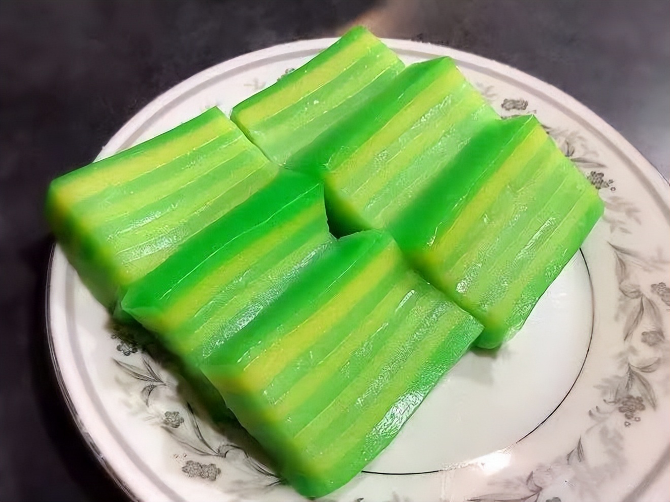 九层糕,就是将米浆和淀粉按一定比例混合,加上糖、椰浆、色素一层一层的蒸熟。制作九层糕的色素不同颜色也有不同味道,譬如黄色的榴莲味、绿色的香草味、巧克力色的可可味等等。蒸出来颜色艳丽且层层分明、糕体晶莹通透,味道香醇。口感q弹爽口。