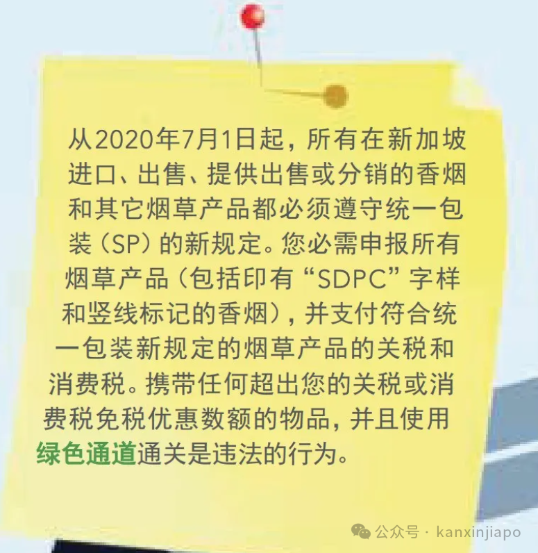 根据新加坡海关条例,所有入境人士如果有携带香烟,哪怕只带一根,都要向海关申报并缴付税款,违例者初犯罚款200新元(每包香烟),再犯的话罚款金额则会增加到500新元。