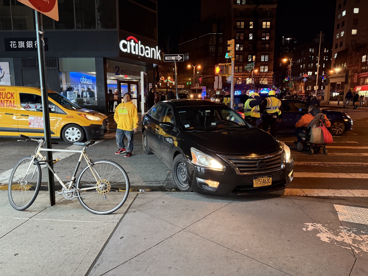 曼哈頓華埠現警匪追車,一輛網約車遭誤撞擋在路中央。(記者劉梓祁╱攝影)曼哈頓華埠現警匪追車,一輛網約車遭誤撞擋在路中央。