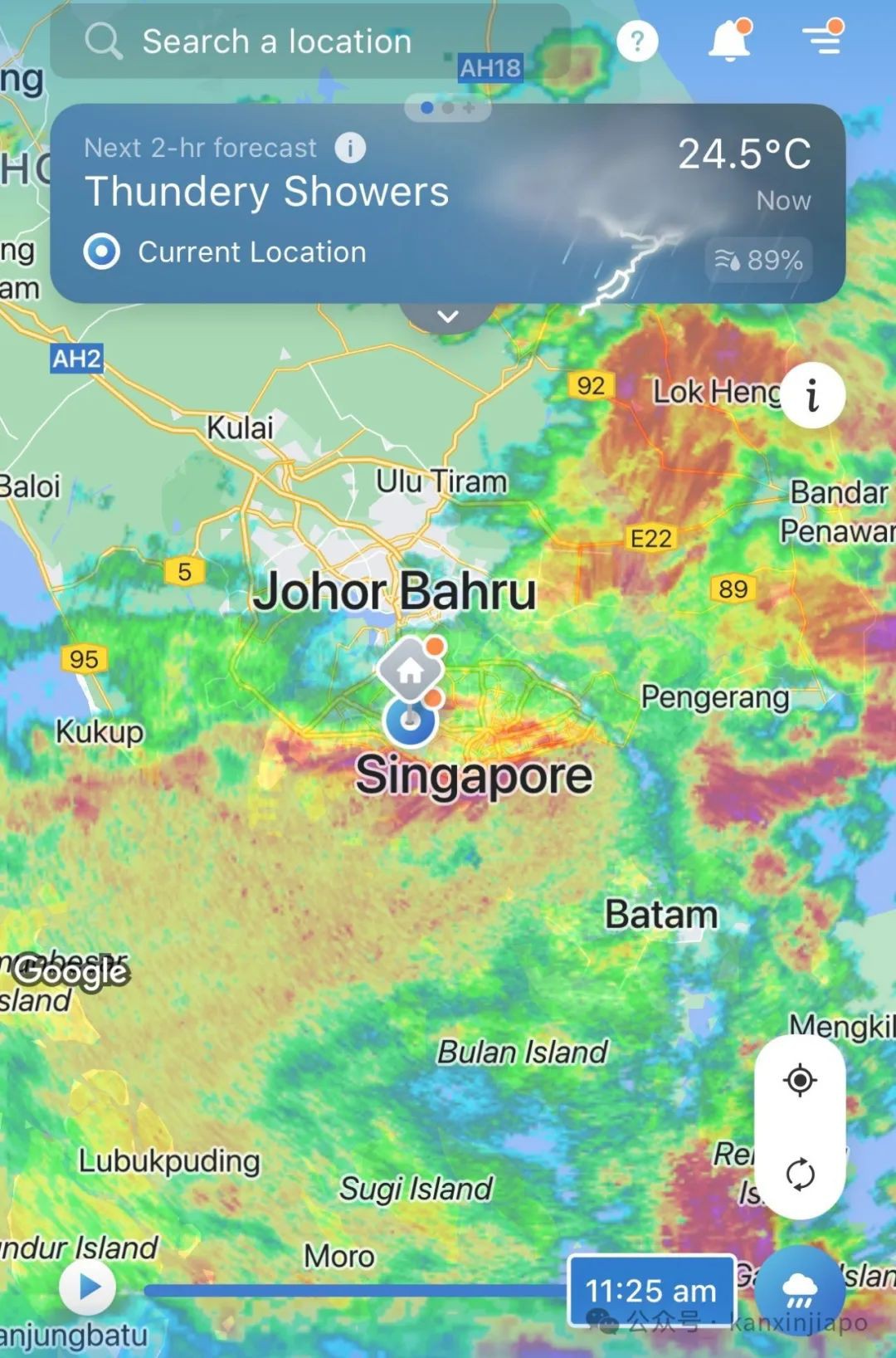今早(9月4日)全岛多处狂下暴雨。 天气雷达图中,连新加坡的轮廓都看不到~ 上午11点25分,气温降至24.5度。 9月的中午实在是很难有这种温度的!