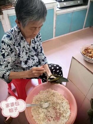 一口咬下去,糯米的软糯芳香,还有肉馅的肉香,十分诱人,很快一个粽子就被我消灭了。 后来出去读书了,回家过节也成了一种奢侈,仿佛天上的月亮,可望而不可及。每年的端午节,我也会去买几个粽子来吃,但都没有吃出自己喜欢的味道。 毕业了,成家了,家婆是印尼归侨,15岁独自回国读书,后来认识了家公,结婚后在我们农场定居。她身材娇小,年轻时也是美人,留着两条长长的辫子,顾盼生辉。家婆心灵手巧,会做很多糕点和印尼菜,她包的粽子是很有名的:小巧,密实,不会漏馅,打开一咬,糯米的香味混合着粽叶的清香,馅料的肉香在舌尖弥漫开来,保准让你食欲大动,一下子就把一个粽子干完了。她包的粽子是华侨风味的粽子:先把糯米洗净泡水几个钟头后捞起沥干水分,放菜篮备用;粽叶要用专门的竹子叶(以前和家公去农村采,现在都是到超市买,不用大张的粽叶,她说竹子叶包的粽子才香),把竹子叶洗净后用水煮,捞起沥干水,剪掉头尾部分,也放篮里备用。绑粽子的绳子要用山上的麻绳,端午节前有人拿来卖,家婆习惯买一把的,这样可以先缠在一个钩子上,待到粽子全部绑好后,一起下锅煮。麻绳也要洗好分成一缕缕的备用。糯米泡好后,锅放油,放红葱、蒜头爆香,糯米倒入锅中炒,加少许盐,酱油,稍加翻炒后拿起,糯米就准备好了。馅料准备:到市场购买半肥瘦的猪肉切成手指头状小块,然后放红葱,盐,酱油,虾米等炒熟即成。接下来家婆坐上小凳,把麻绳一挂,粽叶一摆,糯米和肉馅放在桌前,开始包粽子了。我曾经在一旁看她怎么操作,想学,可是最后还是放弃了,因为我笨手笨脚,根本学不会。只见她拿起两张竹子叶,排好,熟练地转一个漏斗形,往里面加两调羹糯米,放肉馅,再盖上糯米,然后再一转竹子叶,麻绳一捆,一个漂亮的四角形的粽子就包好了。家婆做粽子喜欢自己做,她说人多嘴杂,最后会把粽子搞坏。一般一个粽子大约一两左右,一斤米大概可以包十个粽子。粽子包好后,家公生火,粽子一串串地放进锅内,加水,开始煮粽子了,往往要煮上几个小时。因为家婆的巧手和家公的勤劳,嫁过来后好多年,都是我放学回到家,粽子已经煮好了,一串串地挂在钩上,发出诱人的光泽,还有它特有的粽香。每年端午的早晨,我都会 泡上一壶茶,拿上一个粽子,打开粽叶,小口细咬,品味着粽子的肉香和茶香,心里在默默地感谢婆婆的辛劳。 家婆说,她们在印尼生活的时候,每逢中国人的节日她们都会过,比如春节,端午节等等。我问她,你们也吃粽子吗?她答:对呀!每到端午,家里一定要包粽子吃,怀念自己的祖国,自己的家乡。说着说着,家婆眼睛湿润了,我知道她又在思念印尼的亲人了。我也明白了粽子蕴含的意义:那是国外游子思乡的一种精神寄托呀!在海外,她们吃着香糯的粽子的同时,怀念伟大的诗人屈原,也在怀念祖国,怀念远在天边的家乡。如今回国了,家婆每年都包粽子,这不也是对留在印尼的亲人们的一种思念之情吗? (雨林编辑,作者:严尧 )