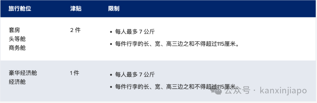 据新航,经济舱的手提行李重量限制在七到十公斤之间。对于电动行李箱,若需托运,旅客必须将可拆卸的锂电池拆下,并将其带入机舱;不可拆卸的锂电池,锂金属含量不能超过0.3克,锂离子的锂金属含量则不能超过2.7瓦时。手提上机的电动行李箱中,可拆卸电池的容量可高达160瓦时,而不可拆卸电池的限制同样适用上述标准。